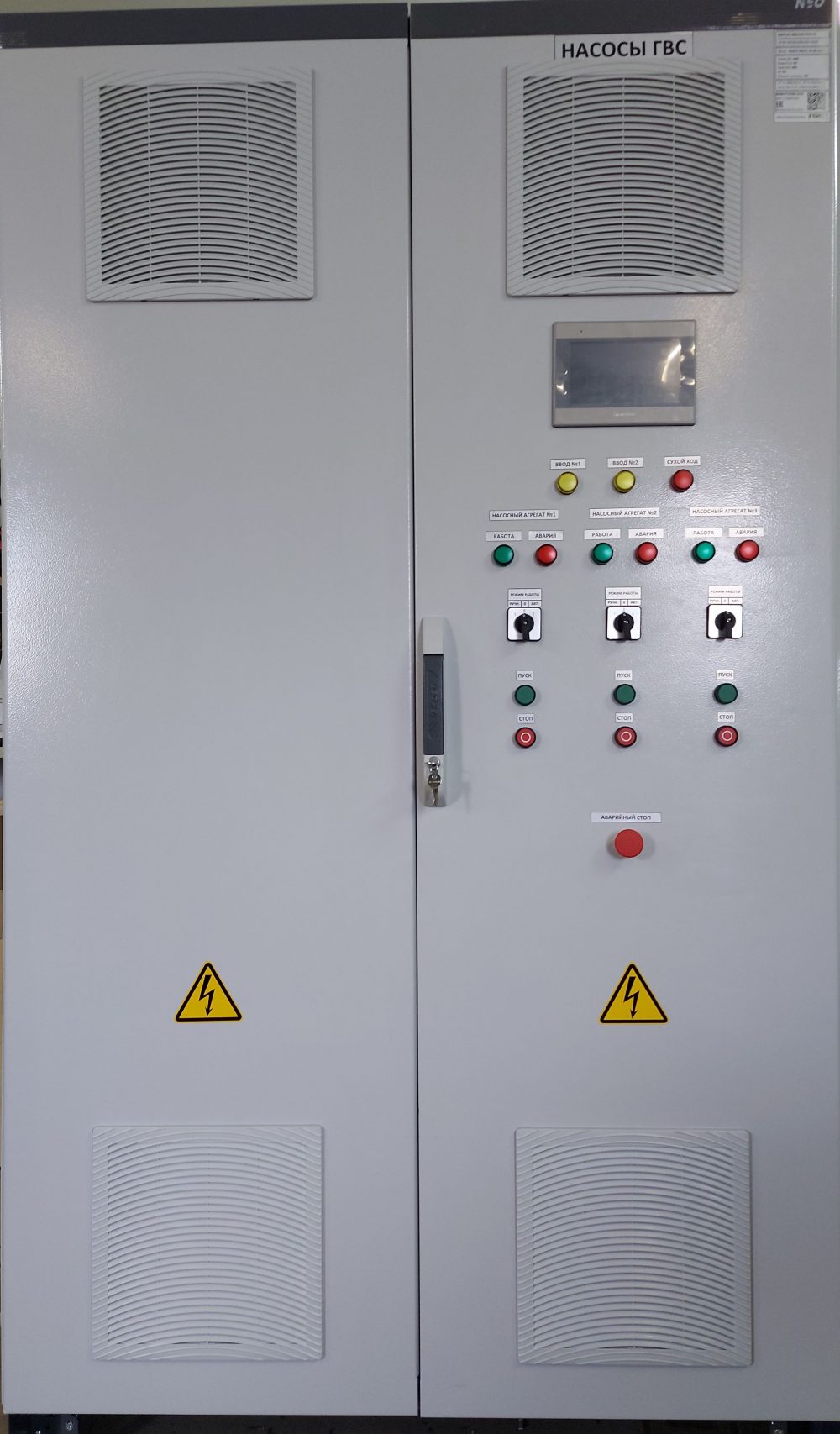 - Защита и безопасность: Шкаф управления оснащен системой аварийной сигнализации и защитой от перегрузок, короткого замыкания и перегрева насосов. В случае неисправности система автоматически отключает насосы и выводит предупреждающее сообщение.